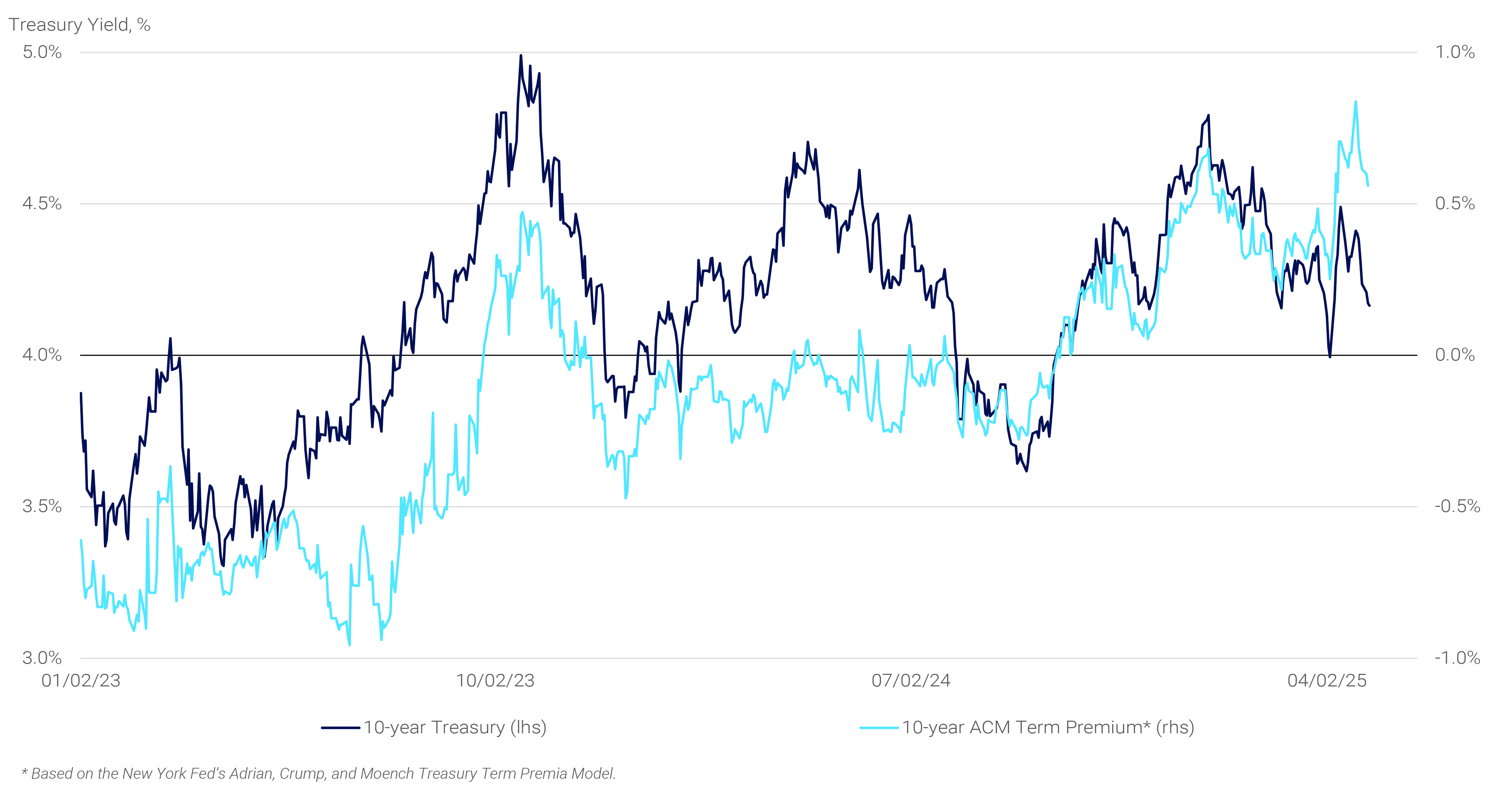 Uncertainty weighed heavily on markets in April as tariff-related announcements triggered a sharp and immediate deterioration in risk sentiment. Market participants quickly repriced expectations for U.S. growth resulting in a meaningful move across markets: equities declined and the dollar weakened, but unlike in a typical risk-off move, U.S. debt markets sold off. Ten-year Treasury yields traversed a 70-basis point (“bps”) range within one week in early April as term premium surged. The ICE BofA Move Index – a measure of short-term implied interest rate volatility – rose to its highest levels since the fall of 2023.