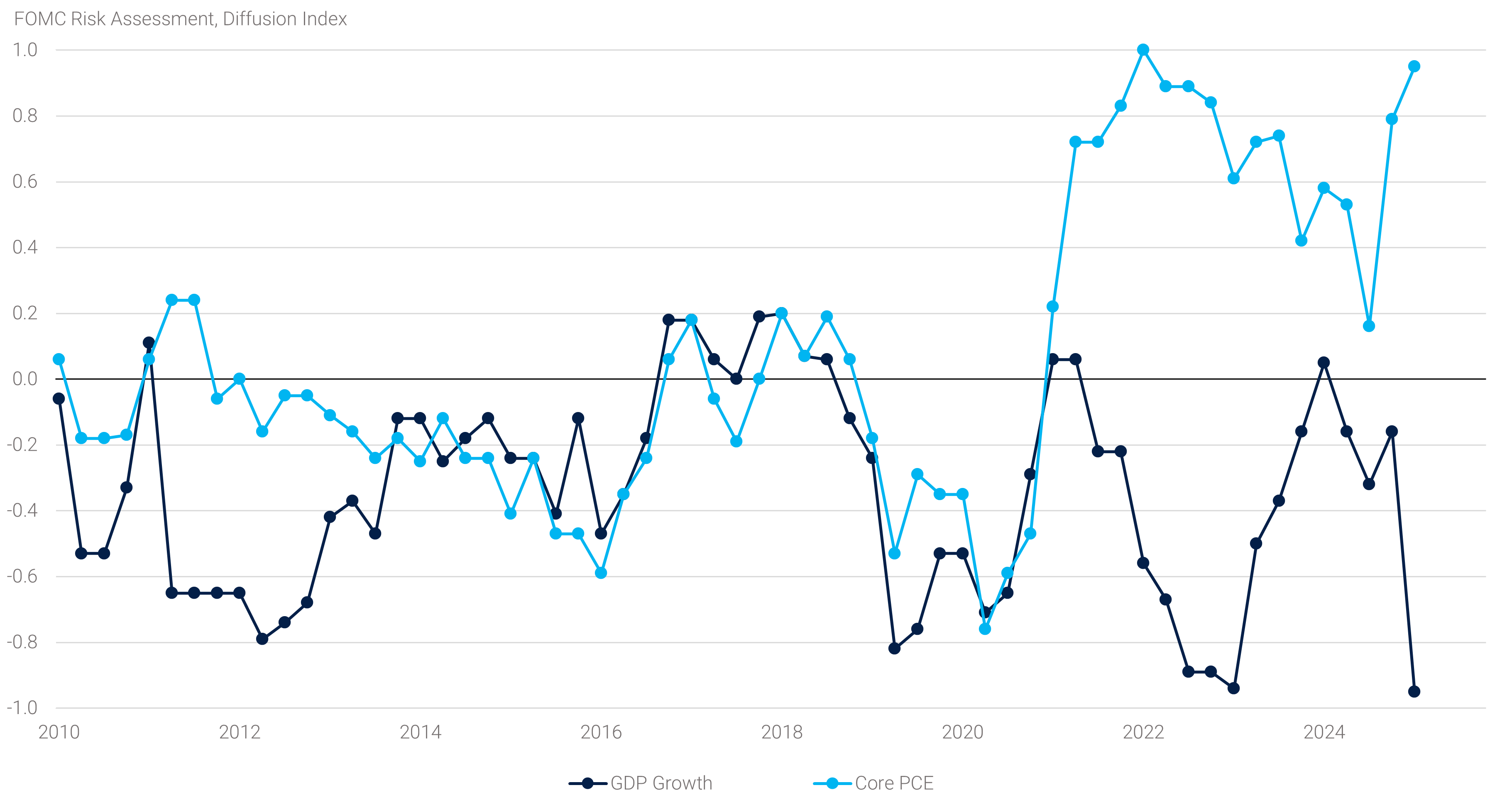In light of the lack of progress on inflation along with heightened uncertainty on growth, Fed policymakers have opted for a more cautious tone in their view of the economy. Notably, prior language that suggested the Federal Open Market Committee’s (“FOMC”) employment and inflation objectives were roughly in balance was updated to highlight increased “uncertainty around the economic outlook” at their March meeting. The release of the updated economic forecast reflected widely expected near-term adjustments. Specifically, the median 2025 GDP growth forecast was downgraded to 1.7% and the 2025 core PCE inflation forecast was revised upwards to 2.8%. Moreover, when assessing their economic projections, most FOMC members see an upside risk to the PCE forecasts and a downside risk to their economic growth forecast, thereby highlighting the undesirable economic outcome of the 1970s: stagflation (see panel 3).(4)