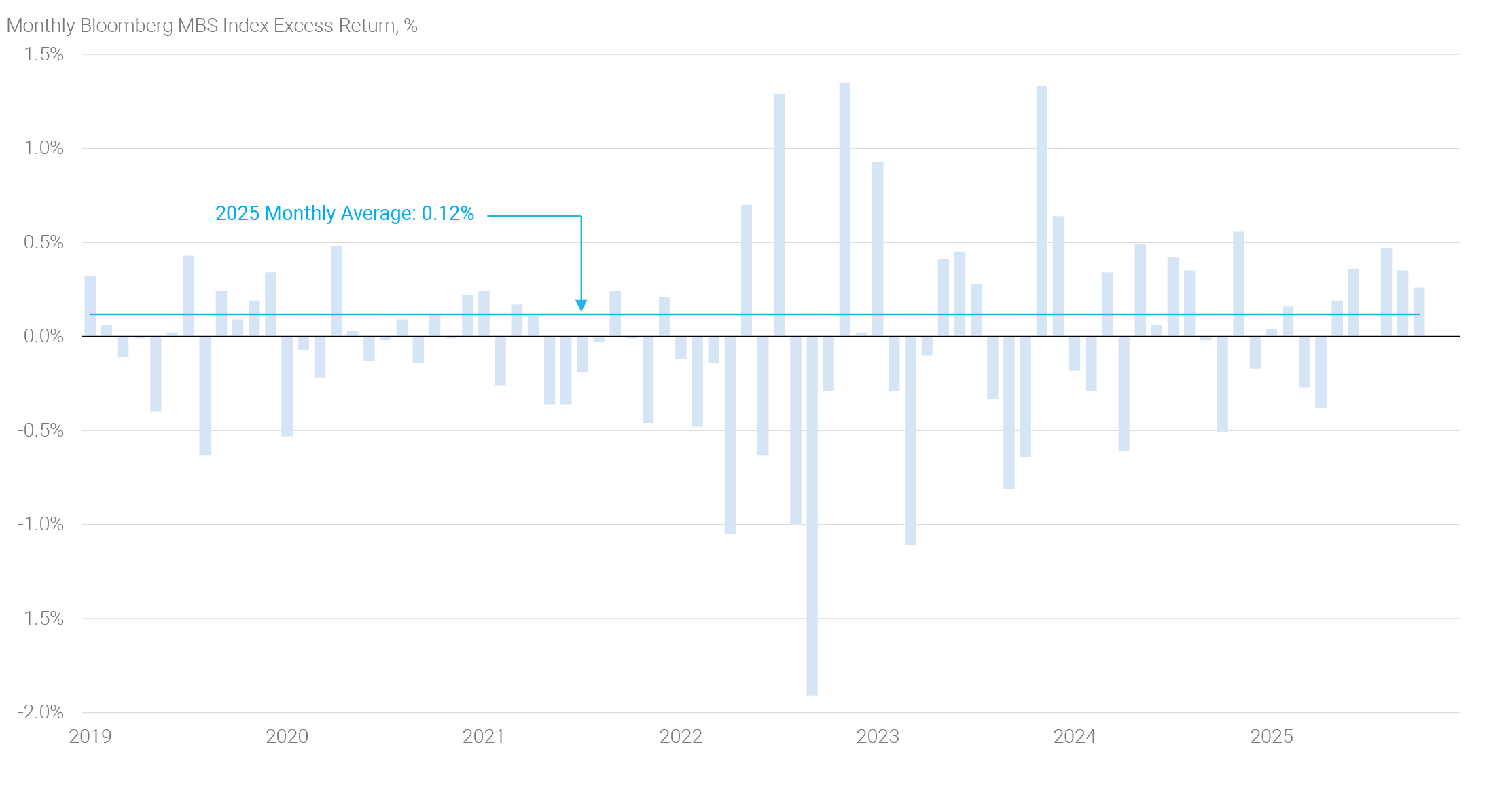 “No official government data, no real problem” must have been the mantra of financial markets in October, as the optimism that has dominated much of the past few months continued, in turn driving equities higher, credit spreads tighter, and Treasury yields lower. Agency MBS further benefitted from strong fixed income fund flows and low interest rate volatility.