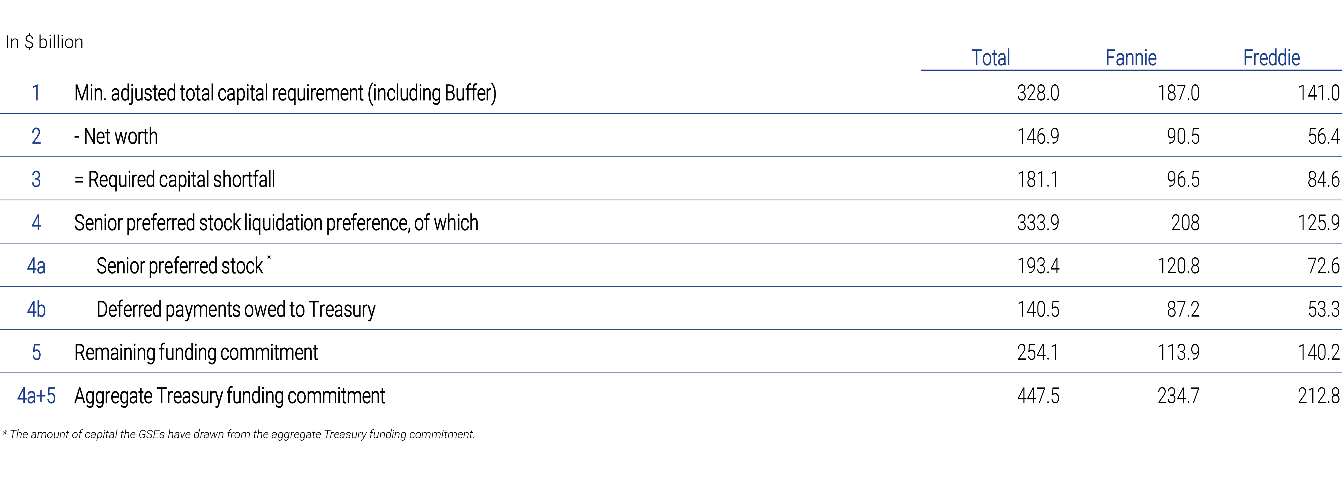 The initial PSPAs required the GSEs to make 10% dividend payments to the Treasury in exchange for their financial backing. Treasury also received warrants to purchase 79.9% of the GSEs’ common equity at a nominal strike price. As earnings were insufficient to cover the initially agreed upon payments, the PSPAs were amended multiple times. A 2012 amendment recalibrated the quarterly dividend to be essentially the GSEs’ quarterly net income and suspended the periodic fee for Treasury’s remaining funding commitment. Subsequent amendments waived dividend payments, allowing the GSEs to increase their net worth, which stood at a combined $146.9 billion as of Q3 2024 (see panel 4). The increased net worth, combined with a cleaner guarantee book, has led to the GSEs having a cleaner risk profile today. Nevertheless, they are still in a significant regulatory capital shortfall position. Moreover, foregone payments have also been added to Treasury’s liquidation preference, which stood at a combined $333.9 billion.