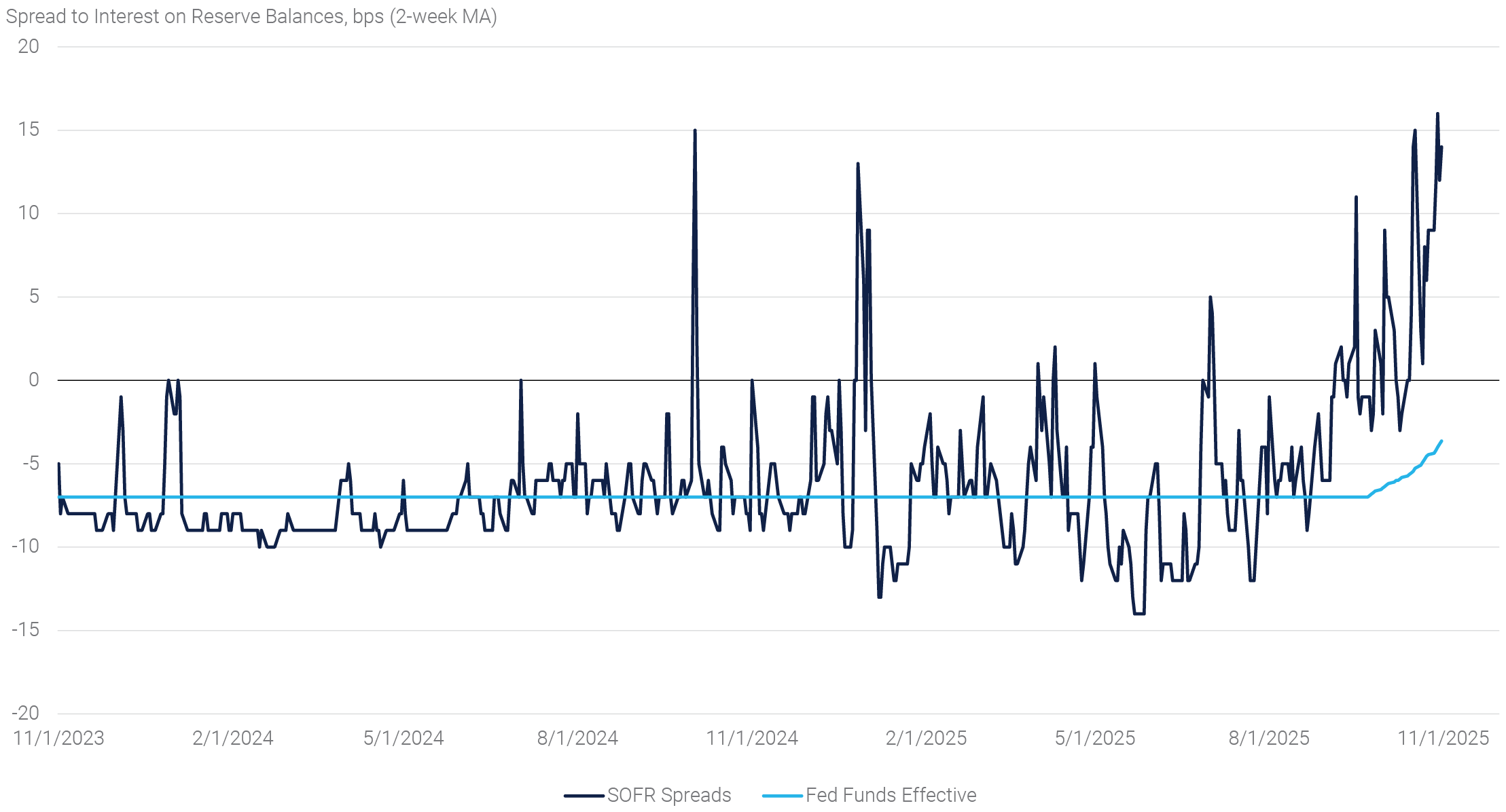 Short-term interest rate markets continued to see increased pressure in October, with the Secured Overnight Funding Rate and other short-term benchmark interest rates rising relative to the Fed Funds Target Range throughout the month (see panel 1). The increased pressure appears to be driven by bank reserves falling below $3 trillion in late September – a level long believed to be a potential water mark between “abundant” and merely “ample” reserves.(4) The Fed’s decision to end its balance sheet runoff, discussed in more detail below, is in direct response to the higher front-end funding rates. In addition, the Treasury Department issued $196 billion of Treasury bills net of maturities in October, adding to the pressure to short-term rates.(5) While higher funding rates increase financing costs, markets have continued to trade orderly. The Fed’s Standing Repo Facility – a recent addition to the toolkit that could help provide a ceiling in rates – has seen more frequent usage in recent days, though at an average of $10.6 billion across 10 days in October, usage remains limited, signaling opportunistic uptake rather than broad-based pressure.